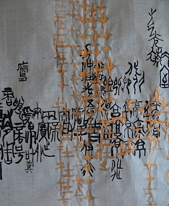 Family Tree (Detail), sumi ink, shellac based gold ink, graphite on rice paper, 53.5 x 12 in ( 135.89 x 30.48 cm )